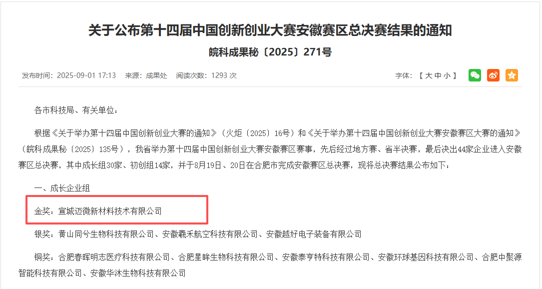 迈微新材料全资子公司在第十四届中国创新创业大赛安徽赛区总决赛中,斩获成长企业组金奖。继2024年获得创业安徽大赛金奖后,公司已成为首支在两项省级创业大赛中实现“双金奖”的团队。