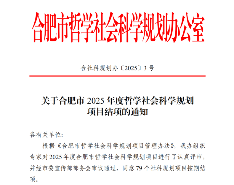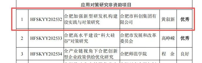近日,合肥市哲学社会科学办公室公布了2025年度哲学社会科学规划项目评审结果,在结项的79个项目中产生“优秀”等次项目28项。合肥市科创集团有限公司承担的课题《合肥加强新型研发机构建设实践与对策研究》获评“优秀”等级。